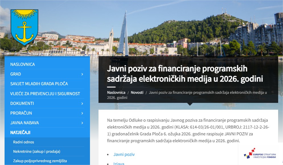 Prije nekoliko dana Grad Ploče objavio je Javni poziv za financiranje programskih sadržaja elektroničkih medija u 2026. godini