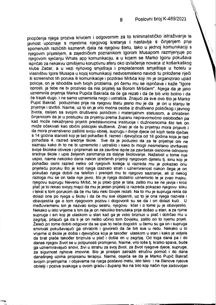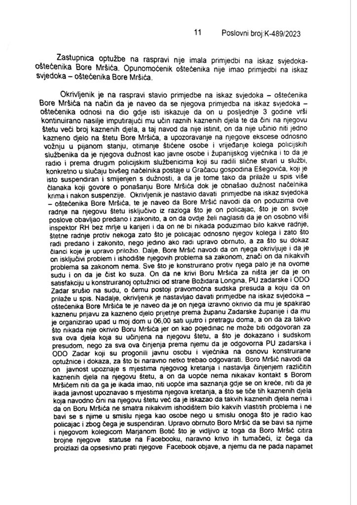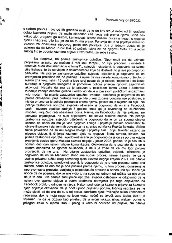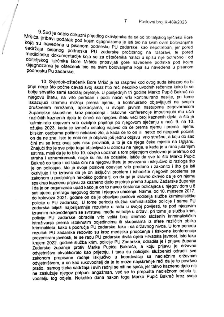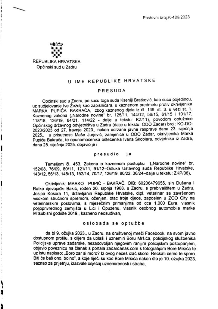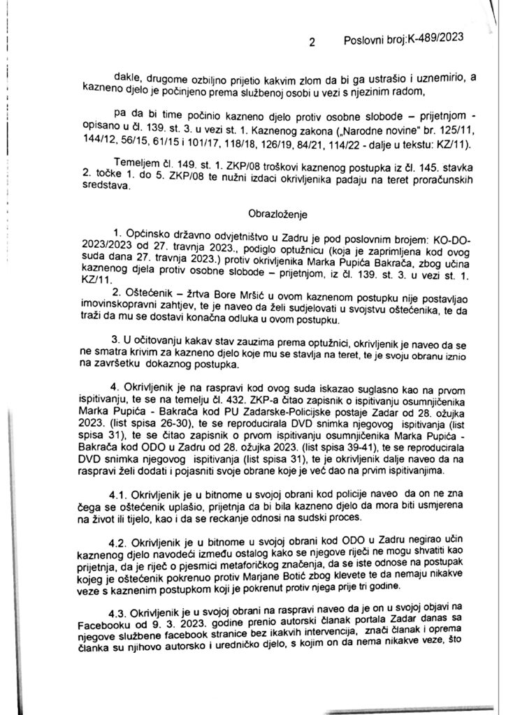 Županijski vijećnik Marko Pupić Bakrač informirao je danas kako je predigao presudu Općinskog suda u Zadru prema kojoj se oslobađa od optužbe da bi svojom pjesmicom zapravo prijetio kontroverznom policijskom službeniku Bori Mršiću