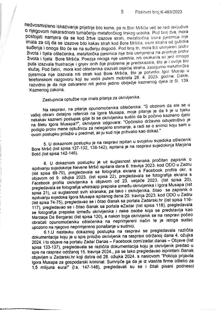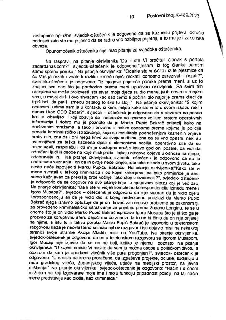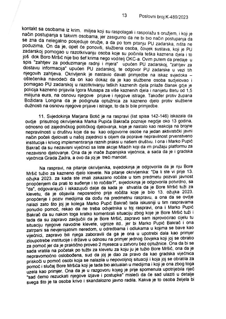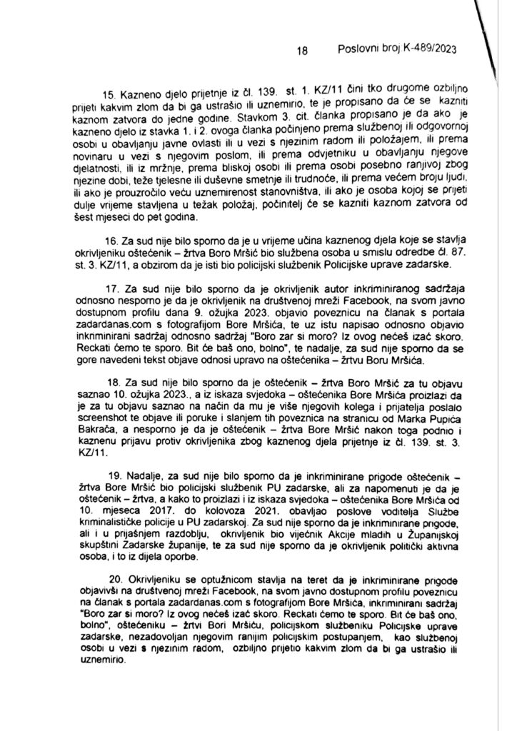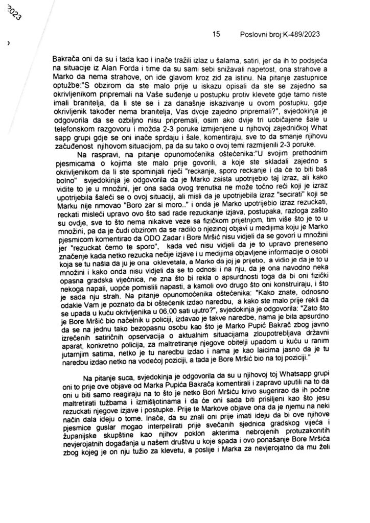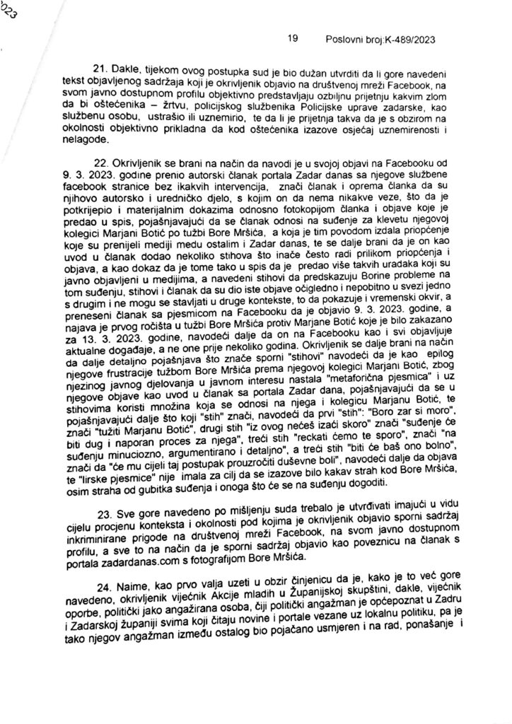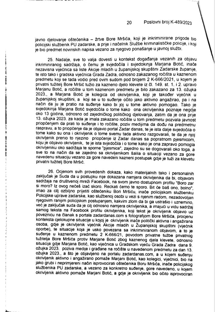 Bore Mršić je tu pjesmicu doživio kao prijetnju i tužio Marka Pupića Bakrača te je sutkinja Ksenija Bratković u siječnju prošle godine donijela oslobađajuću presudu o kojoj danas spomenuti županijski vijećnik govori. Prema svemu sudeći, Marko Pupić Bakrač i nije tako opasan da bi ga se drugi plašili već je riječ o talentiranom pjesniku ili? U nastavku, koga zanima, se može vidjeti preslik presude.