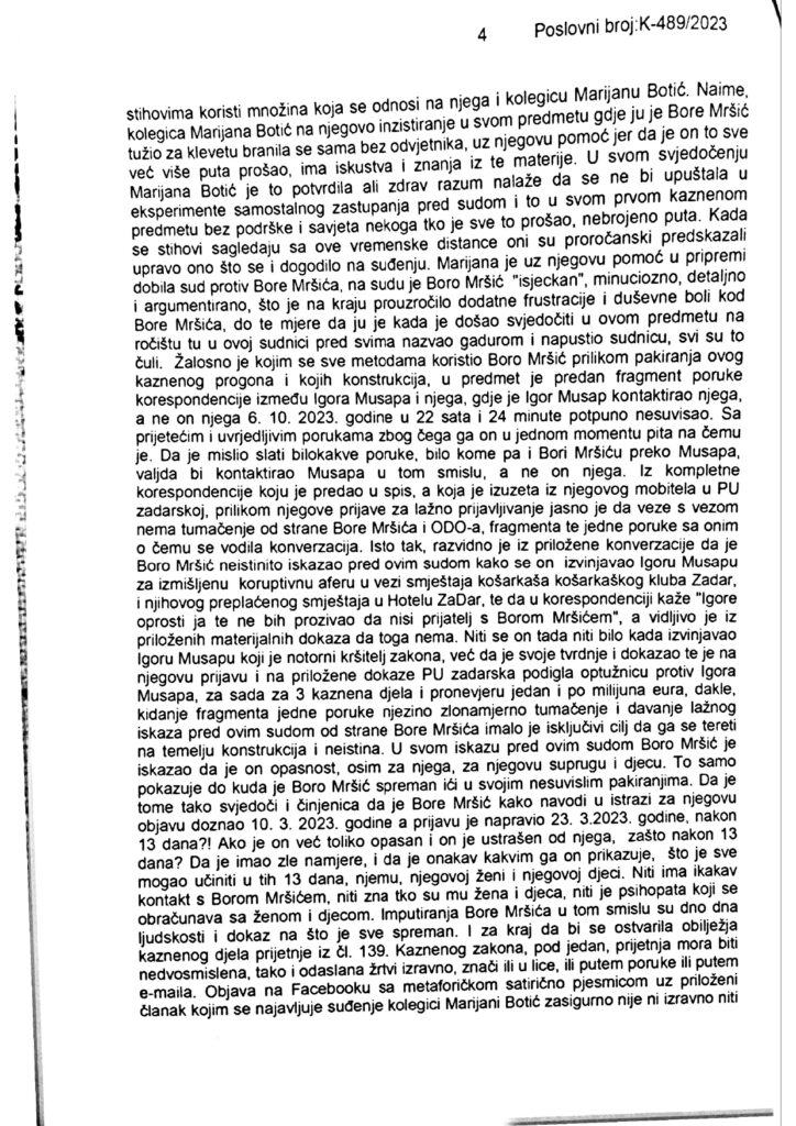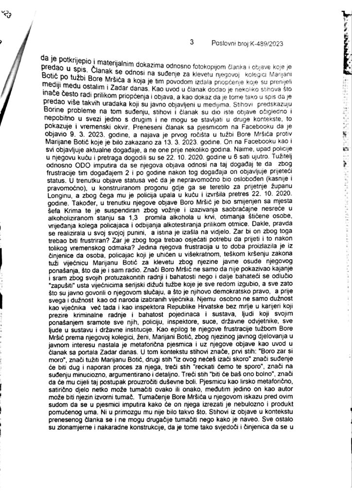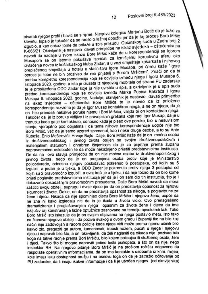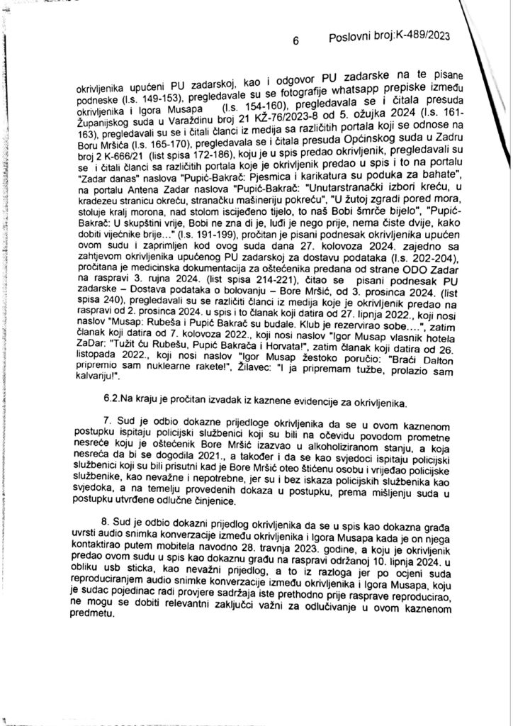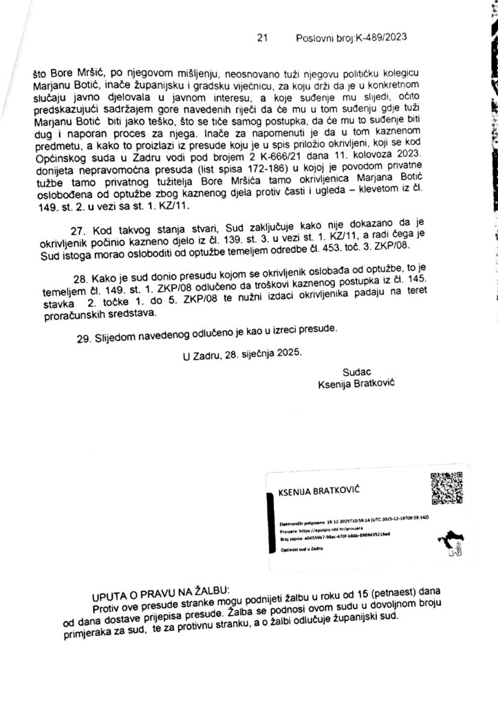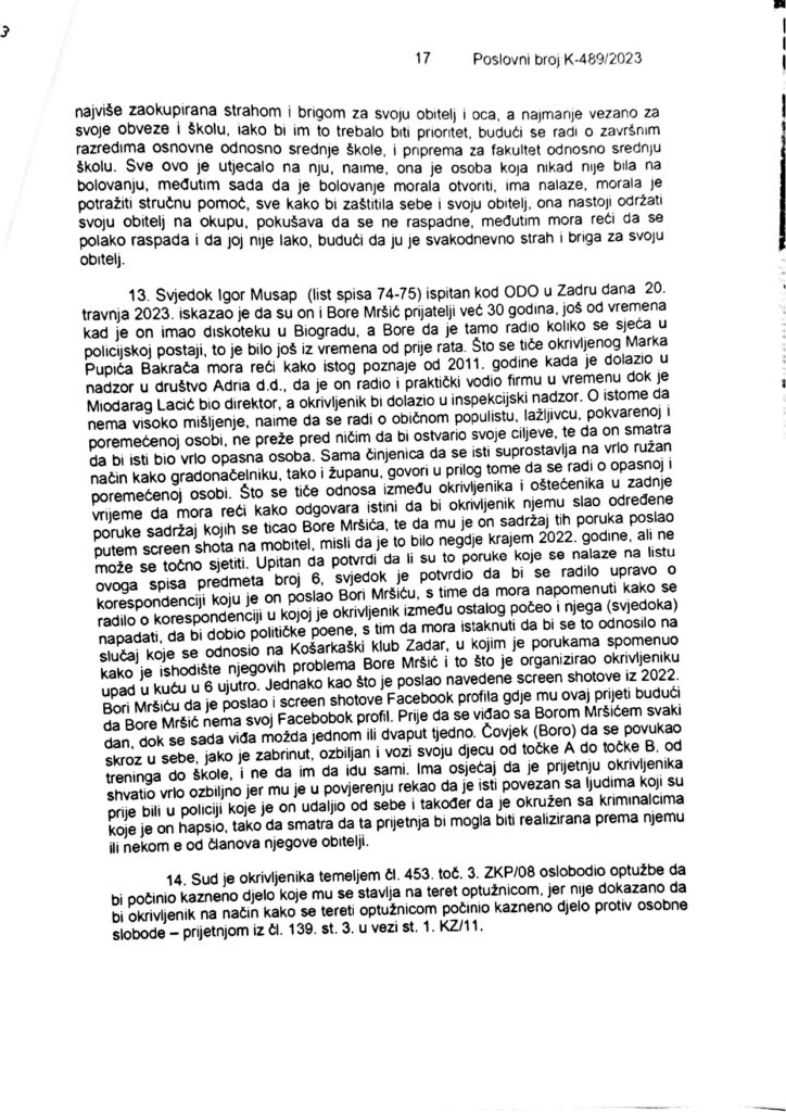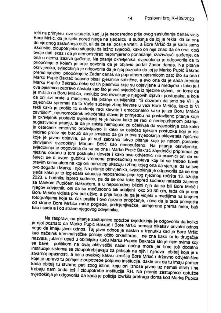 Bore Mršić je tu pjesmicu doživio kao prijetnju i tužio Marka Pupića Bakrača te je sutkinja Ksenija Bratković u siječnju prošle godine donijela oslobađajuću presudu o kojoj danas spomenuti županijski vijećnik govori. Prema svemu sudeći, Marko Pupić Bakrač i nije tako opasan da bi ga se drugi plašili već je riječ o talentiranom pjesniku ili? U nastavku, koga zanima, se može vidjeti preslik presude.