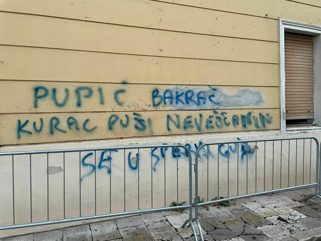 Netko je noćas na zgradi Zadarske županije ispisao uvredljivi grafit koji se odnosi na političara Marka Pupića Bakrača i novinara Ivice Nevešćanina