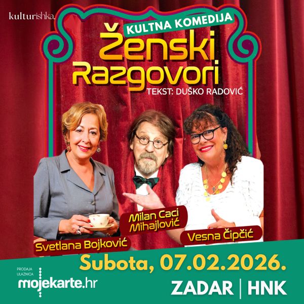 Tri velika glumačka imena — Svetlana Ceca Bojković, Vesna Čipčić i Milan Caci Mihailović — premijerno će u HNK Zadar 07.02.2026. izvesti kultnu komediju Ženski razgovori, nastalu po tekstovima velikog Duška Radovića