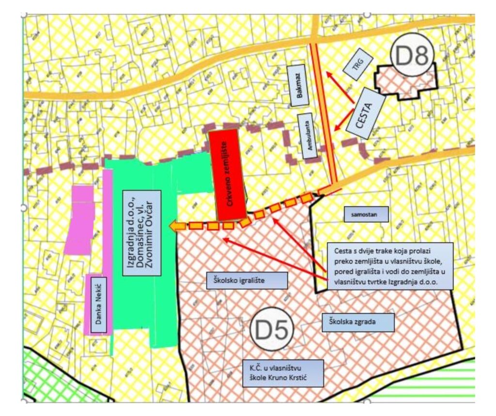 Zanimljiva je i činjenica da je u prostornom planu baš na tom mjestu ucrtana žuta, isprekidana crta, koja u kartografiji označava „Ostale ceste“, a koja u naravi ne postoji jer se na tom dijelu čestice nalazi zelena površina. Ne postoji ali je ucrtana. Nakon što grad ucrtanu cestu malo pomakne i proširi te asfaltira, cesta dobiva legalitet i može se proglasiti Nerazvrstanom cestom koja podrazumijeva bezuvjetno pravo korištenja. Prijedlog jednog mještanina da se buduće školsko igralište zarotira te time ispriječi između školskog parkirališta i zemljišta u vlasništvu gospodina Ovčara, nije izazvao oduševljenje gradskih predstavnika i Mjesnog odbora, iako su mještani ideju podržali pljeskom.
