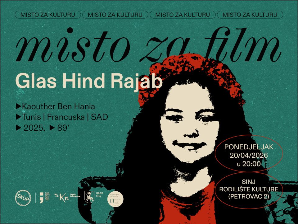 Večeras (20. 4. 2026.), u Rodilištu kulture (Sinj, Petrovac 2), u sklopu programa Misto za film, prikazuje se igrani film “Glas Hind Rajab” (Sawt Hind Rajab, drama, Tunis, Francuska, SAD, 2025, režija: Kaouther Ben Hania)