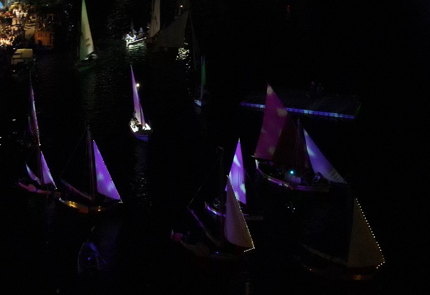 More ispred Zapadne obale oko 18.30 sati pretvorit će se u mediteranski amfiteatar. Iz lučice Jedriličarskog kluba Labud isplovit će tradicijska plovila, regatni krstaši i olimpijske klase, svako sa svojim svjetlosnim efektima na jedrima, stvarajući prizor u kojem se grad i more stapaju u ples svjetla, pokreta i glazbe. Posebno mjesto zauzimat će flotila tradicijskih drvenih brodova Udruge Lantina Vrboska – gajete, leuti, guce i batane – koji će svojom prisutnošću donijeti duh stare pomorske vještine i autentični šarm Mediterana. Očekuje se i dolazak legendarne falkuše, simbola jadranske pomorske baštine, ukoliko vremenski uvjeti to dopuste. Dvadeset minuta trajanja Valcera pod jedrima donijet će spoj umjetnosti, baštine i modernog izraza.