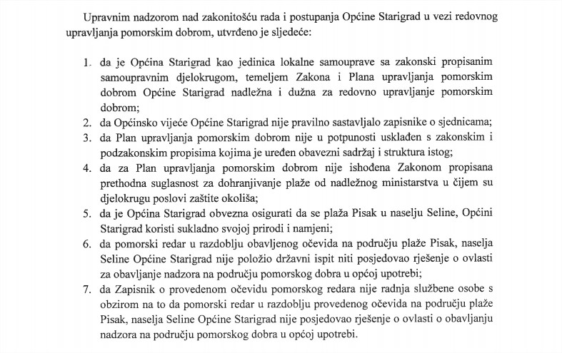 Ipak, upornost se doista nekad isplati, pa je nedavno Uprava pomorstva Ministarstva mora, prometa i infrastrukture, a nakon provedenih nadzora nesporno zaključila kako Općinsko vijeće Općine Starigrad nije pravilno sastavljalo zapisnike o sjednicama, da Plan upravljanja pomorskim dobrom nije u potpunosti usklađen sa zakonskim i podzakonskim aktima, da za Plan upravljanja pomorskim dobrom nije ishođena zakonom propisana prethodna suglasnost za dohranjivanje plaže od nadležnog ministarstva.