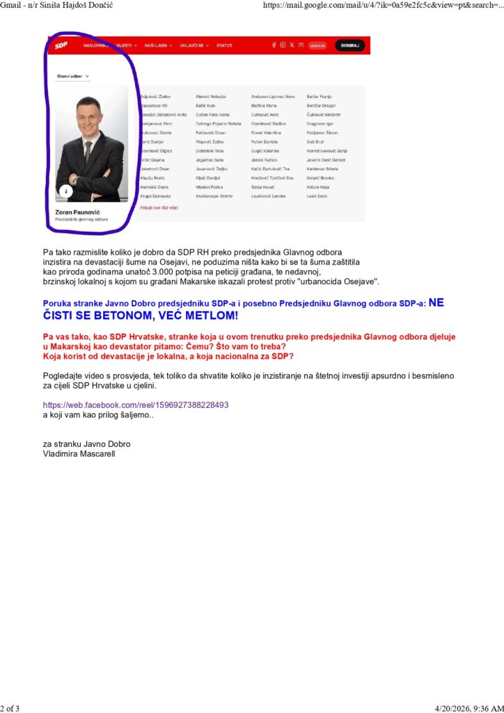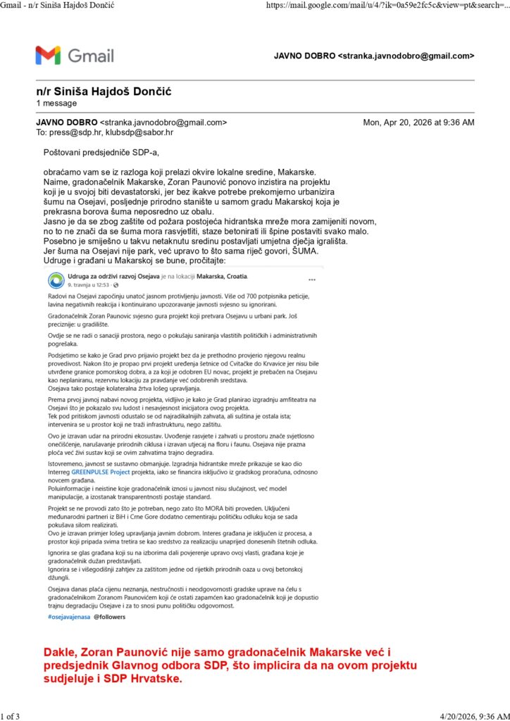 Procjenjujući da subotnji prosvjed neće osujetiti planove gradonačelnika Zorana Paunovića i njegove administracije da na Osejavi betonira, Vladimira Mascarell (Javno Dobro) uputila je jutros pismo Siniši Hajdašu Dončiću kao predsjedniku SDP-a u kojem ukazuje na određene činjenice očekujući njegovu reakciju.